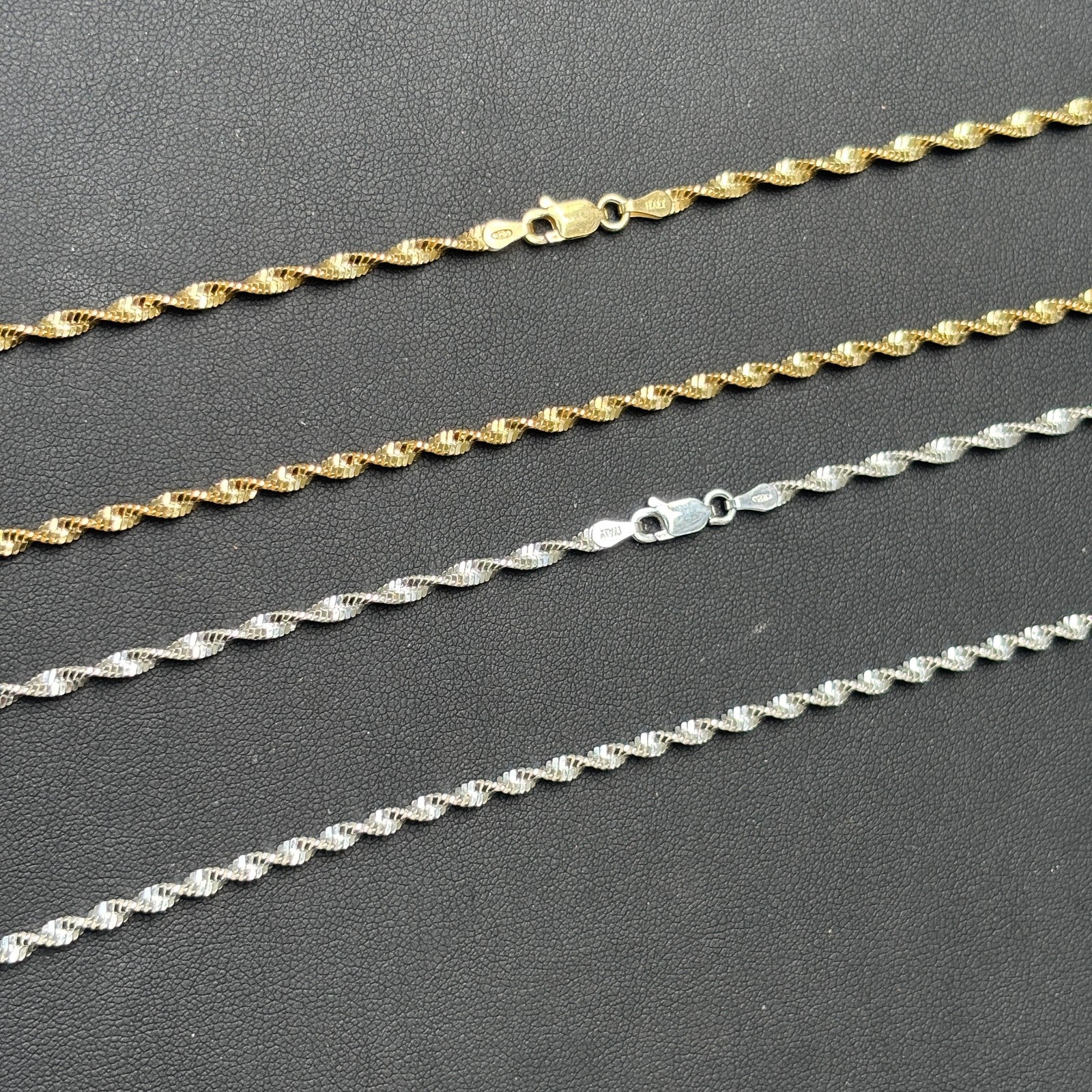 This 2.5mm Singapore Chain is a stylish and durable chain perfect for both men and women. Crafted in Italy from solid 925 sterling silver , it features a twisted design that reflects light beautifully, giving the appearance of sparkle without stones. Available in natural silver or luxurious 14k gold vermeil , it's an ideal choice for everyday wear or layering with other necklaces. Built with a secure lobster clasp and finished with soldered O-rings, this chain is designed to last and shine for years to come.