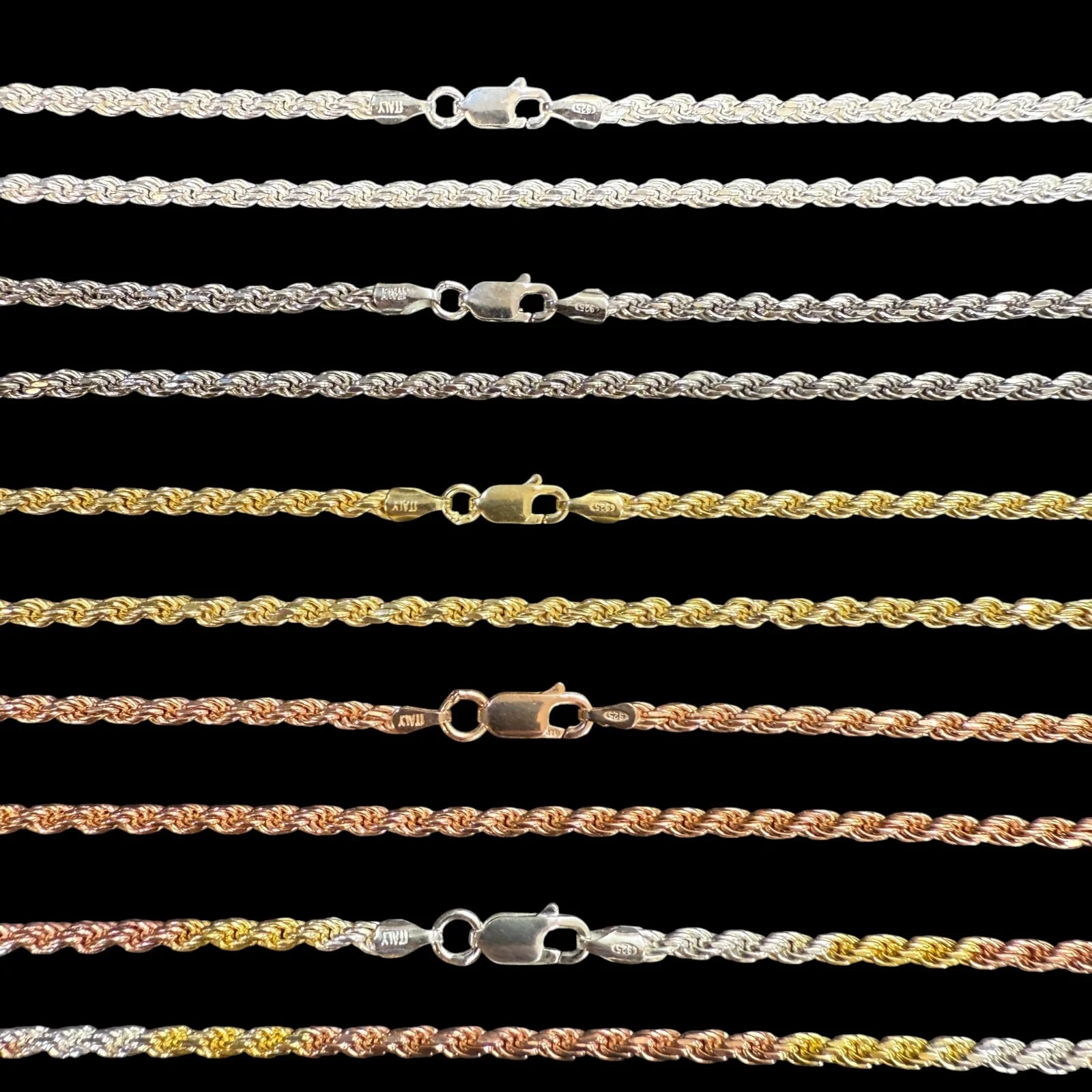 3mm Diamond Cut Rope Chain – Available in 925 Sterling Silver, Rhodium, 14k Gold Vermeil, 14k Rose Gold Vermeil, and Tri-Color