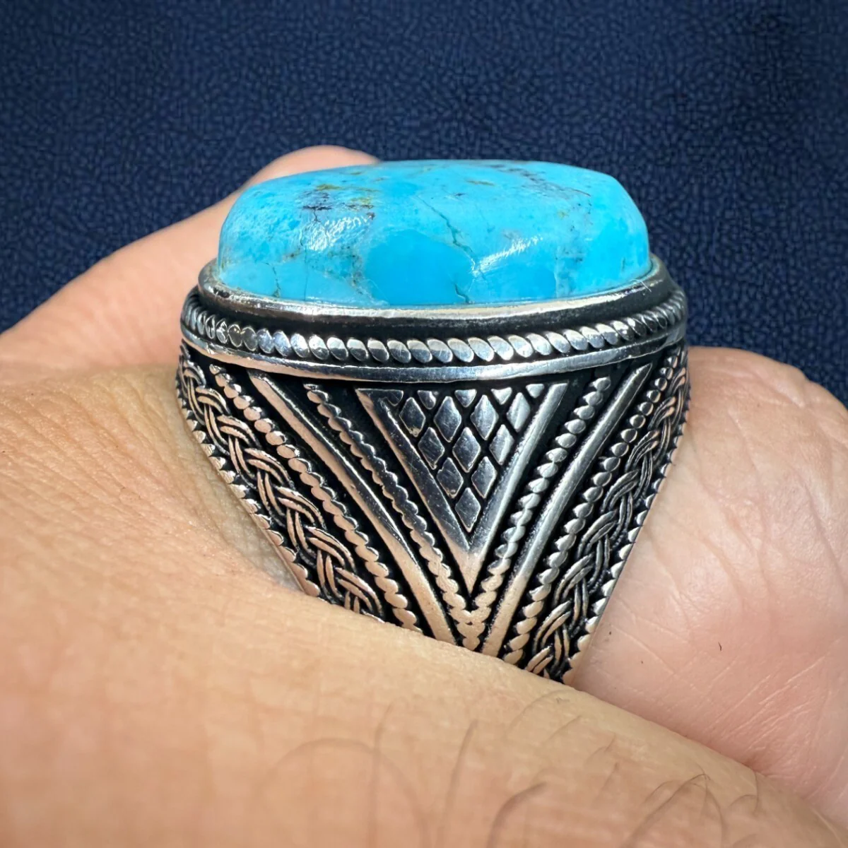 Men’s Solid 925 Sterling Silver Ring with Natural Blue Turquoise – Navajo-Inspired Design